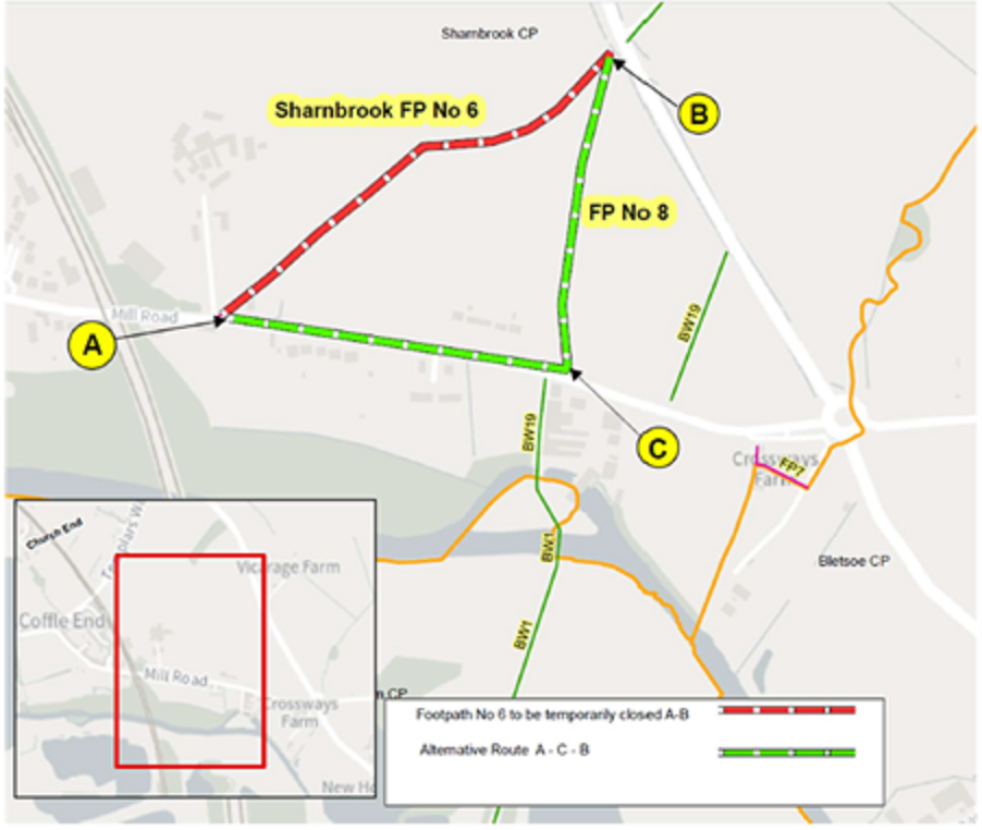 Due to Archaeological and Service Diversional works previously carried out, the proposed Temporary route as shown below in green has already been utilised. As agreed by Bedford Borough Council, we will use the same route until such a time it is safe to re-open an upgraded bridleway route to the public.
